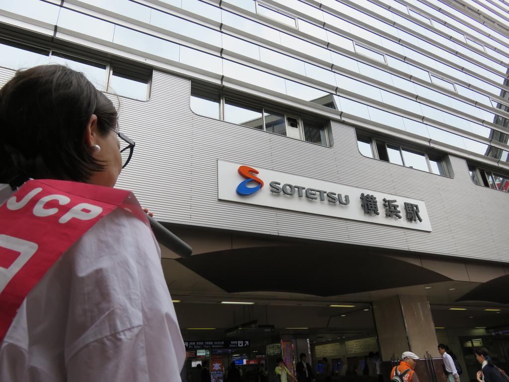 朝は7時半~9時まで横浜駅大宣伝をしました。西口、東口、北東口、北西口と6ヶ所の出入口すべてにあさか由香と共産党ののぼりが立ち、一時間半の間に6回通勤の人に訴えました。