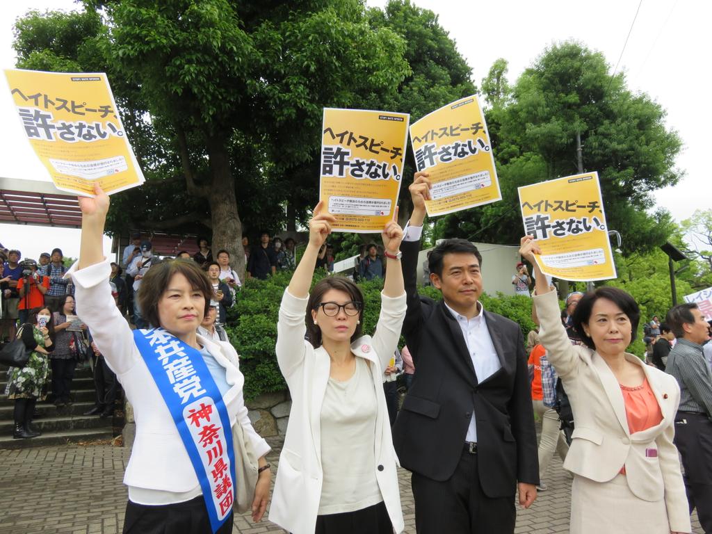 日本共産党は、このヘイトデモに対し畑野君枝衆院議員、あさか由香、椎葉かずゆき参院予定候補、大山、君嶋県議、市古、大庭、渡辺、片柳市議が抗議。武蔵小杉駅前では有田参院議員も共産党街宣に飛び入り。次いで平和公園で抗議行動。なんと二千人の参加でした!