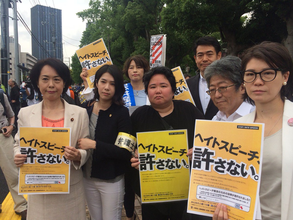 ヘイトデモ主催者は「デモができないのは言論弾圧だ」などと発言。しかし、ヘイトデモに横浜地裁川崎支部は「表現の自由の保障の範囲外」と結論。「差別扇動の自由」などありません。 *写真は「抗議&見守り」の弁護士のみなさんと