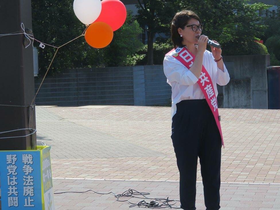 センター南駅で「子どもの未来のために政治を変えよう!6.18in都筑」の宣伝行動に参加。 道行く子育て世代の方々に「長時間過密労働が当たり前の社会で、ママたちが孤独な子育てを強いられている、この現状を変えたい」と訴えました。