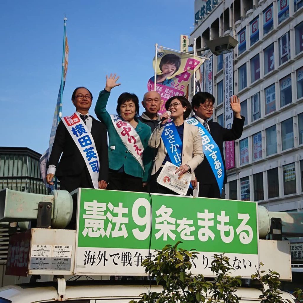 田中りえ子市議、横田英司・岩田やすあき両市議予定候補とともに、小田原駅前で街頭演説。 大企業に中小企業並みの実質税率負担求めれば4.2兆円、経済同友会も求める証券優遇税制の見直しで1.2兆円、消費税に変わる財源はあります! 学生さんからの声援も多く、励まされます。ありがとうございます!