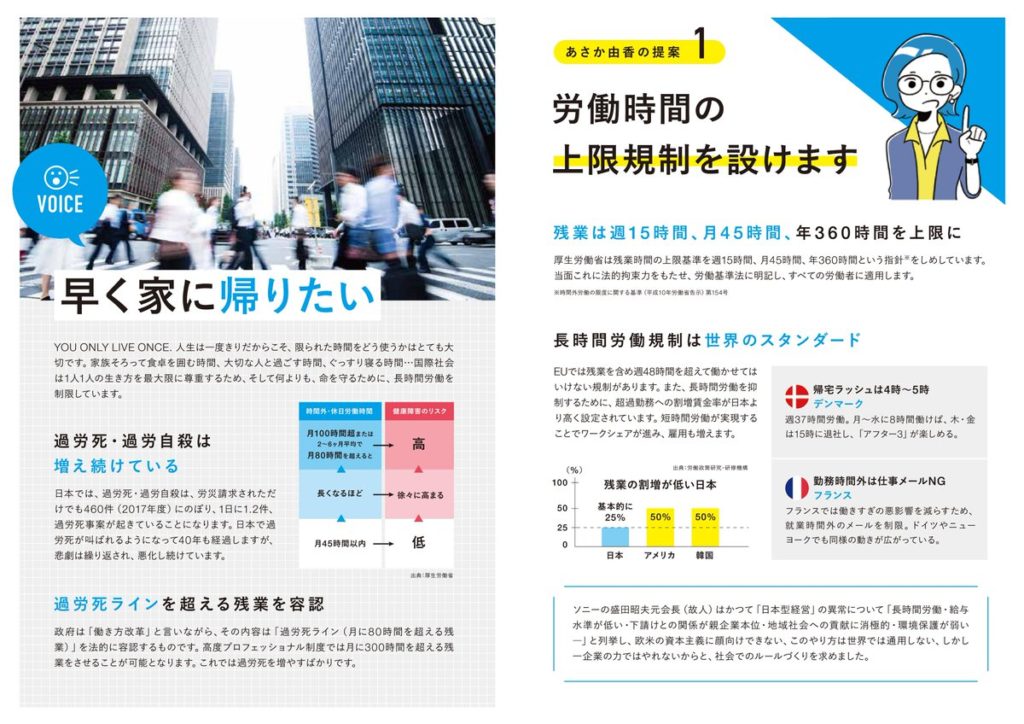 2)提案①は労働時間の上限規制を設けること。私のツイッターでも随時紹介していますが、日本の労働者の働かせ方は本当にひどいのです。2017年度、過労死・過労自殺は労災請求された件数はいくつだと思いますか? なんと460件。1日に1.2件、過労死事案が起きています…。続 #あさか労働政策のナカミ