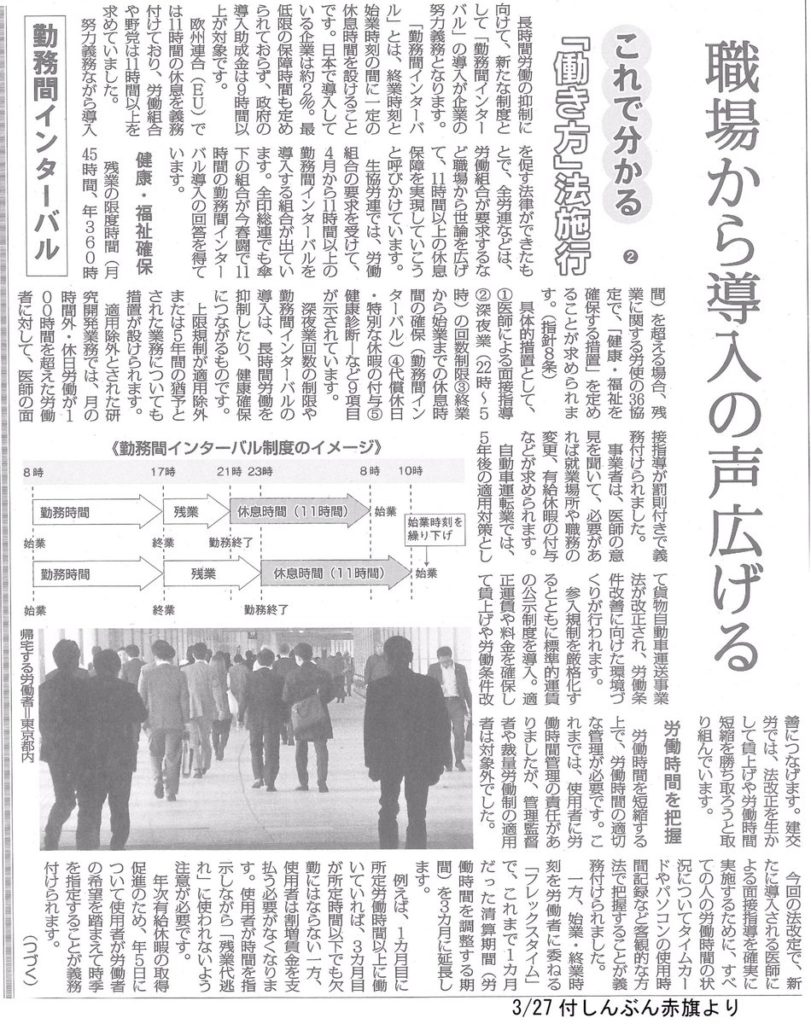 4月施行の #働き方改革 一括法では、EUで11時間の休息が義務付けられている #勤務間インターバル が企業の努力義務となります。日本は最低限の保障時間も定められていませんが、11時間以上のインターバル導入の回答を得ている労働組合もあります。労組の出番!#8時間働けばふつうに暮らせる社会へ