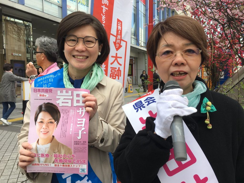 昨日の午前中は川崎区。看護師45年の 県会候補「全国3位の財政力なのに老人福祉費は全国45位、教育予算は最下位(1人あたり)。税金の使い方を変えよう。誰もが病院にかかる権利がある、国保料の引き下げを」と訴え。岩田さんの病院仲間チームと栄養価で盛り上がったお昼時間。