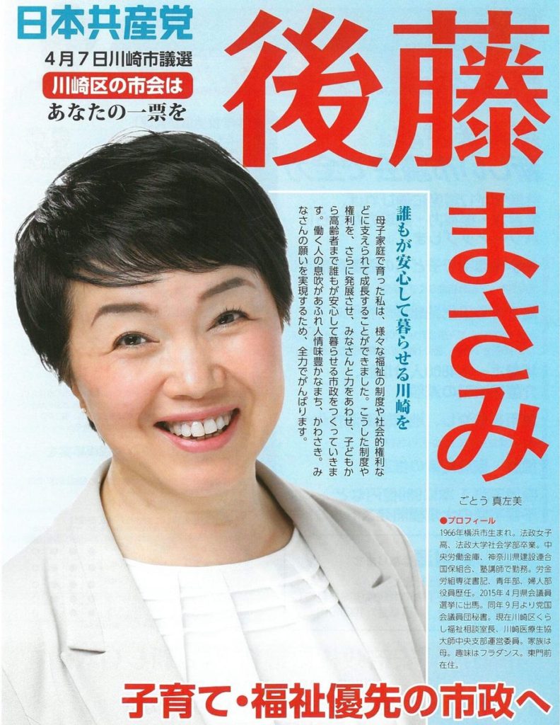 川崎区② 後藤まさみ市会候補は3歳で父親を亡くし母子家庭で育った方。弱者に寄り添い続けてきた女性活動家。後藤候補は、とても優しく、芯の強い方。私自身も含め、その言葉と姿勢にどれだけ励まされてきた人がいるだろう。後藤さんの笑顔には優しさと強さが詰まっている。税金の使い方、変えよう!