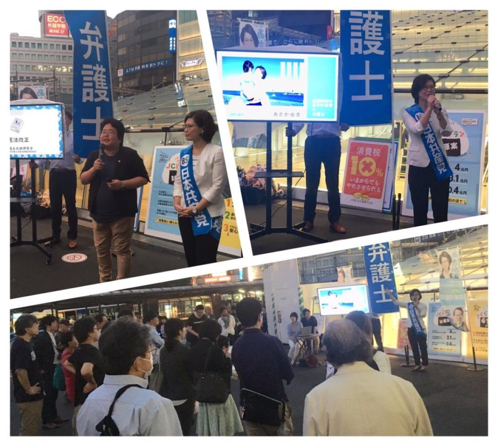 昨夜、横浜駅西口で弁護士×あさか由香企画の第1弾。大型モニターを使っての宣伝活動でした。 労働、子育て、原発、憲法の各分野の第一線でたたかう弁護士さんが、それぞれの分野で政治が役割を果たすべきだと感じていることを訴え。私への応援メッセージをいただきました。頑張ります