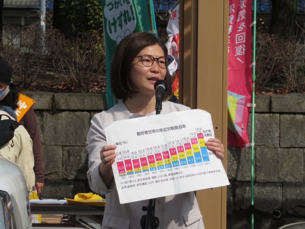 ①消費税税率が上がり続けた結果、年収800万円の勤労世帯の税負担率が同じになってしまった。税の大原則である「能力に応じた負担」「累進制」が壊されてしまったという大問題。